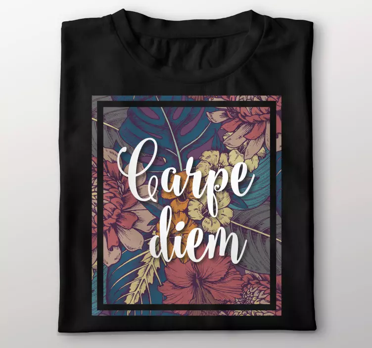 Poročilo: T4902Ta živahen dizajn vsebuje frazo 'Carpe Diem', prepleteno s pisanimi cvetličnimi elementi. Črna osnova poudarja drzne in veselo barve ter ustvarja spodbudno vizualno izkušnjo. Popolno za tiste, ki cenijo mešanico lepote in motivacijskega izraza.