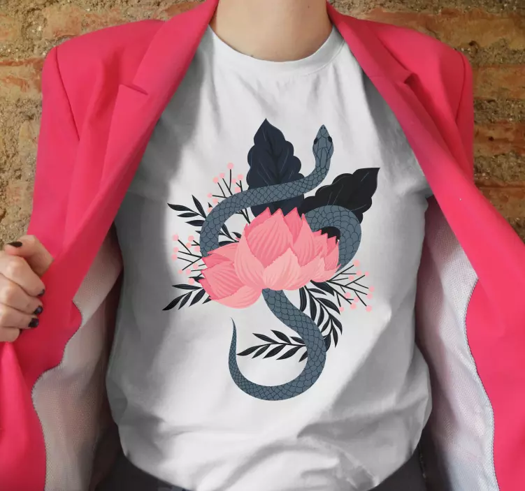 Majica z motivom kače in cvetja prinaša edinstven in sodoben dizajn, ki združuje očarljivo kačo z elegantnim lotosom ter nežnimi cvetnimi listi in listi. Ta botanični stilizirani motiv v roza in črni barvi prinaša dotik narave v vašo garderobo. S svojo moderno estetiko je ta majica popolna izbira za vse, ki iščejo nekaj posebnega.