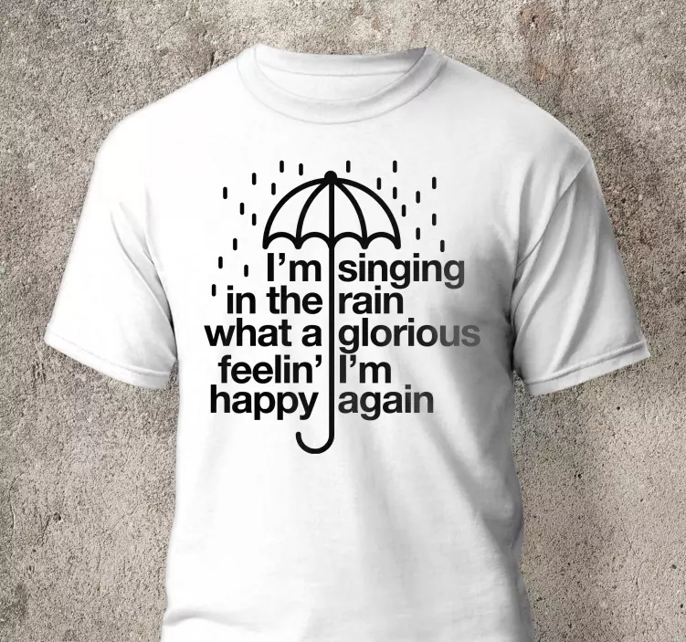 Poročilo: T4934Ta dizajn prikazuje veselo dežnik, obdan z dežnimi kapljami, dopolnjen z vzpodbudnim besedilom. Ujame veselo dušo in spodbuja pozitivnost tudi v oblačnem vremenu. Stilna tipografija doda igriv pridih, kar ga naredi popolnega za vsakogar, ki želi izraziti svojo ljubezen do življenja in glasbe.