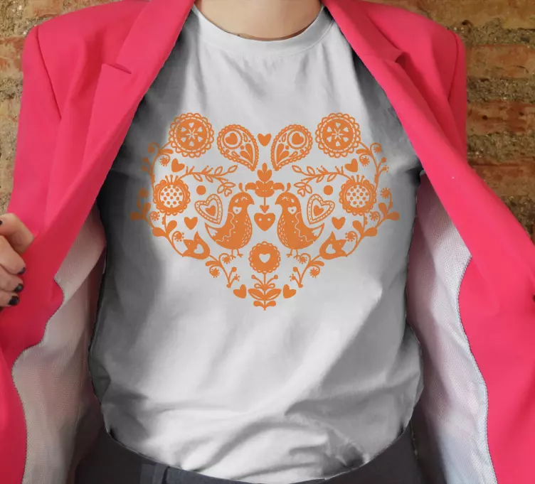 Majica z vzorcem ptic v obliki srca prinaša edinstven dizajn, ki združuje tradicionalno folkloro z modernim slogom. S svojimi črnimi in belimi barvami ter očarljivimi vzorci ptic in rož, ki oblikujejo srce, ta majica odraža ljubezen in spoštovanje do narave in tradicije. Vsak detajl te majice je skrbno zasnovan, da vas navdihne in očara, ter vnese kanček ljubezni in lepote v vašo garderobo!