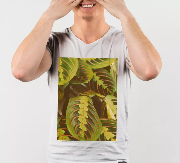Odkrijte čarobnost narave z našo majico z vzorcem zelenih listov, ki prinaša svežino in živahnost tropskih džungel. S čudovito ilustracijo marante in botaničnih listov, ta majica odraža eksotičen duh narave ter ponuja edinstveno teksturo, ki vas bo navdušila. Njena zasnova je poslikana z naravnimi elementi, kar ji daje poseben pečat in vas povezuje z naravo.