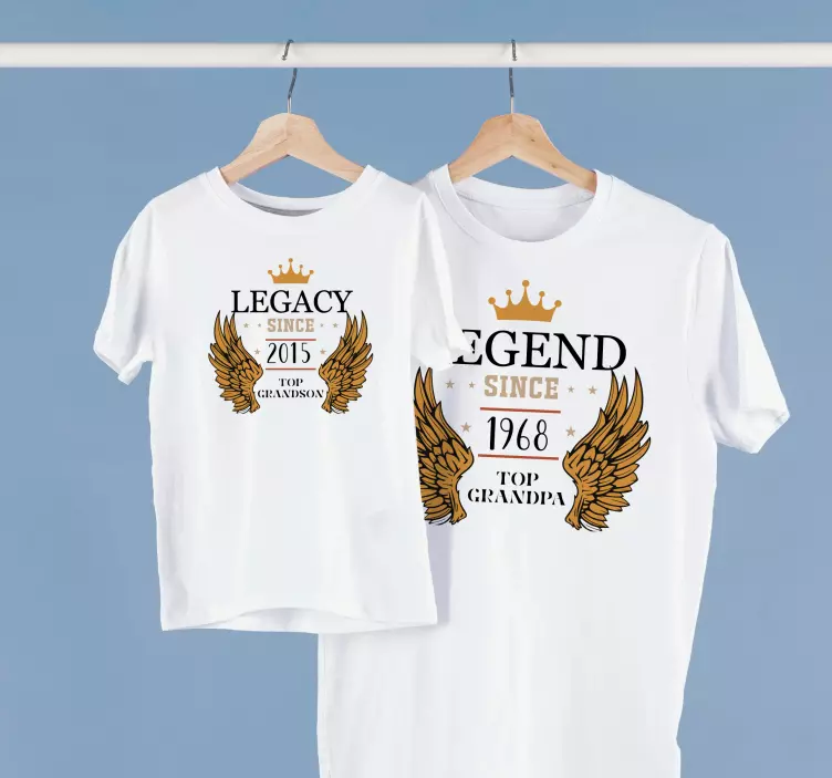 This short-sleeved shirt is the perfect way to show family pride in a fashionable way. The design features a crown with wings and the accompanying text: legacy from... Top grandson, legend from... Top grandson. This matching shirt for grandfather and grandson is a unique way to show your family bond and will look great on all occasions. It is made of high-quality cotton that is comfortable to wear and can be machine washed, making it a great piece for everyday wear.