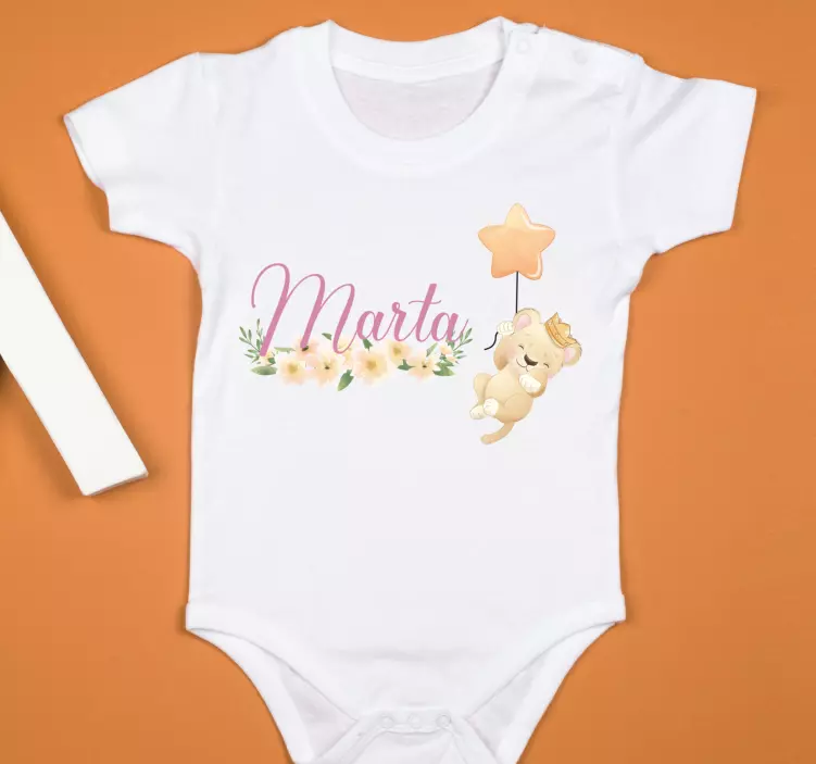 Poročilo: T5219Ta očarljiv dizajn prikazuje ljubkega medveda, ki drži balon v obliki zvezde, obogatenega z nežnimi cvetličnimi elementi. Ime 'Marta' je elegantno vključeno v umetniško delo, kar ustvarja veselo in osebno noto, ki je popolna za otroška oblačila.