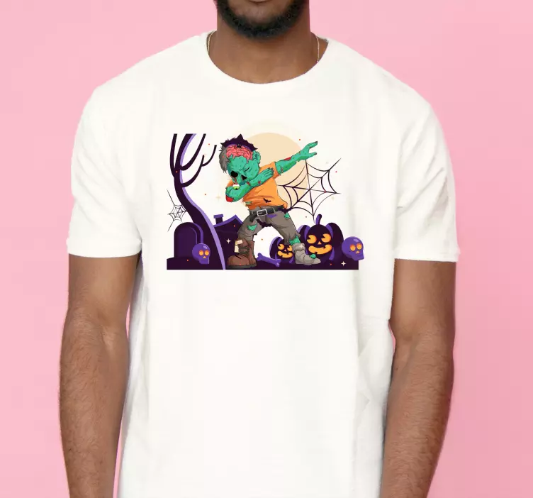 Odkrijte Zombie dance halloween theme majico, ki vas popelje v svet strašljivih zabav! Ta unikatni dizajn, ki vključuje grozljive zombie like, izrezljane buče in lobanje, je popoln za noč čarovnic. S svojo strašljivo grafiko bo ta majica zagotovo pritegnila pozornost na vsaki zabavi. Zeleni ton kože zombijev in temna atmosfera noči čarovnic ustvarjajo pravo vzdušje, ki ga potrebujete za nepozabno izkušnjo. Pripravite se na grozljivo zabavo!