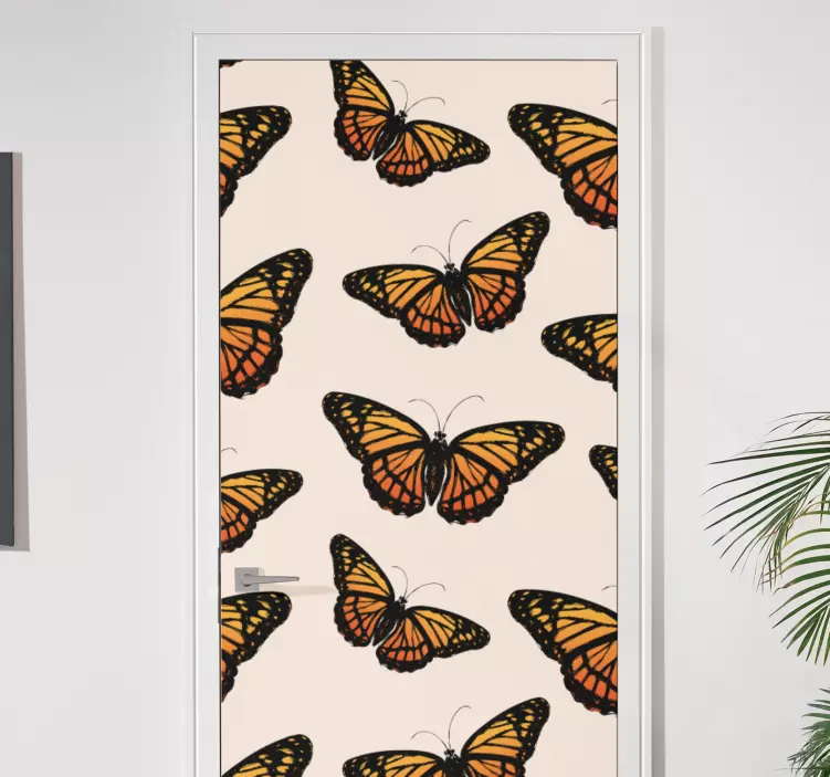Barvita ilustracija metulja nalepka za vrataOdkrijte čarobnost narave z našo barvito ilustracijo metulja nalepko za vrata! Ta čudovit dizajn vključuje metulje monarhe v oranžnih tonih, ki prinašajo svežino in veselje v vsak prostor. Grafična oblikovanje nalepke je zasnovano tako, da se popolnoma prilega vašim vratom in doda dekorativni pridih, ki vas bo navduševal vsak dan. Uživajte v naravnem vzorcu, ki bo pritegnil pozornost vseh obiskovalcev!