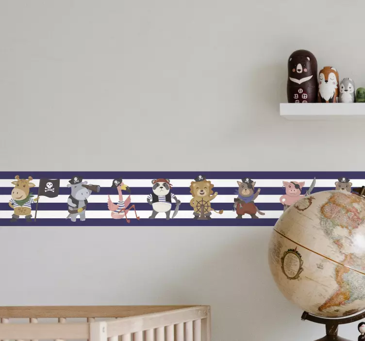 Poročilo: A47219Živahna zbirka živalskih likov s piratsko tematiko, prikazanih v igrivih pozah. Vsaka žival nosi različne piratske dodatke, kar ustvarja prijetno in pustolovsko vzdušje, idealno za otroške prostore. Oblikovanje vključuje črte, kar dodaja stilskemu pomorskem elementu celotne teme.
