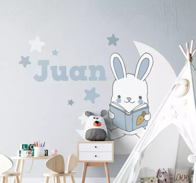 Poročilo: A51047Sanjarska zasnova, ki prikazuje očarljivega zajčka, ki bere knjigo, obdanega s zvezdami in polmesecem. Popolno za personalizacijo otroškega prostora, ta igriv motiv spodbuja mlade bralce in dodaja kanček magije v sobo.
