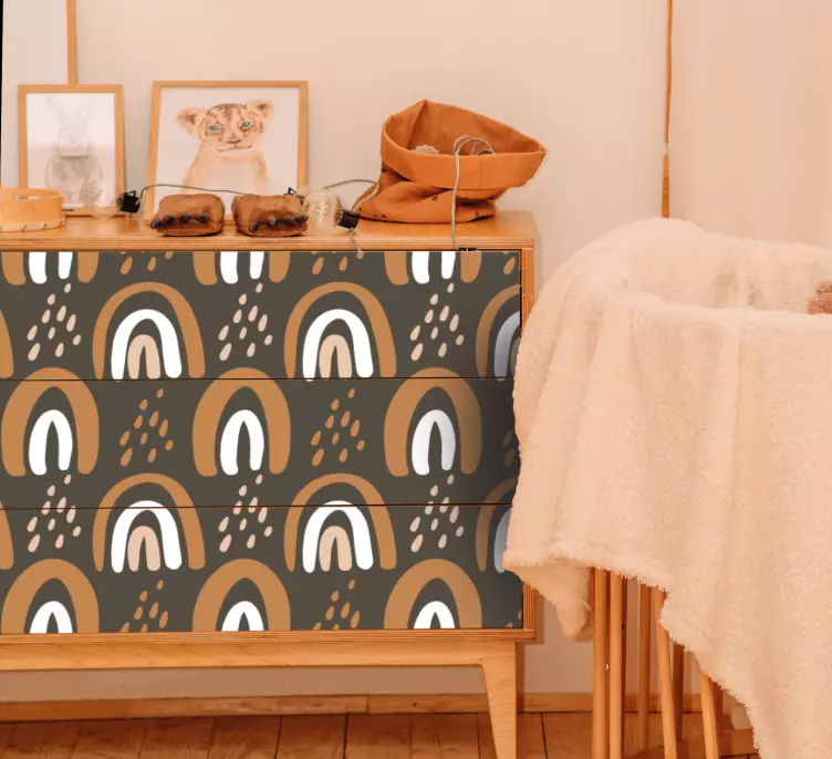 Odkrijte Colorful arch patterns nalepka za pohištvo, ki prinaša barvitost in igrivost v vaš dom. Ta moderna nalepka se ponaša z unikatnim dizajnom, ki vključuje mavrične barve, geometrijske vzorce in teksturirane detajle, kar jo naredi idealno za popestritev vašega pohištva. Njena zasnova je osvežujoča in privlačna, kar vam omogoča, da ustvarite prijeten in sproščen ambient.