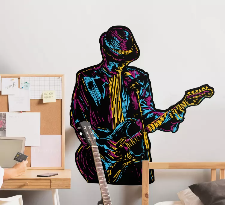 Uživajte v edinstveni Colorful guitarist silhouette glasbeni nalepki, ki prinaša živahen in dinamičen pridih vsaki prostoriji. Ta čudovit dizajn prikazuje kitarista v barviti silhueti, kar vzbuja občutek strasti do glasbe. S svojo grafiko, ki vključuje doodle elemente, ustvarja občutek svobode in ustvarjalnosti ter je idealna izbira za vse ljubitelje glasbenih inštrumentov, še posebej električne kitare.
