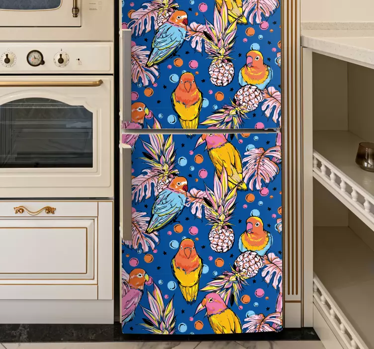 Odkrijte našo edinstveno Colorful parrots design nalepko za hladilnik, ki prinaša živahne barve tropskih ptic in ananasov v vašo kuhinjo! Ta osvežujoč dizajn je zasnovan z mislijo na naravo, saj vključuje čudovite papige, ki bodo obogatile vsak prostor. Njihova barvitost in energija bosta zagotovo pritegnila pozornost in vnesla veselje v vsakdanje življenje.