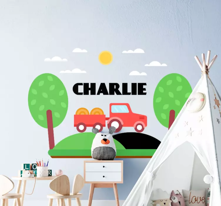 Ustvarite čarobno vzdušje v otroški sobi z našo Custom truck scene nalepko za otroke, ki prinaša vesel in barvit svet kmetijske tematike. Naša nalepka prikaže traktor, kmetijo, tovornjak in čudovito naravo, ki vključuje drevesa in zelenje. Ob sončnem dnevu se bo vaš otrok lahko potopil v svet domišljije in igre, kjer se bo igral s svojimi najljubšimi igračami.