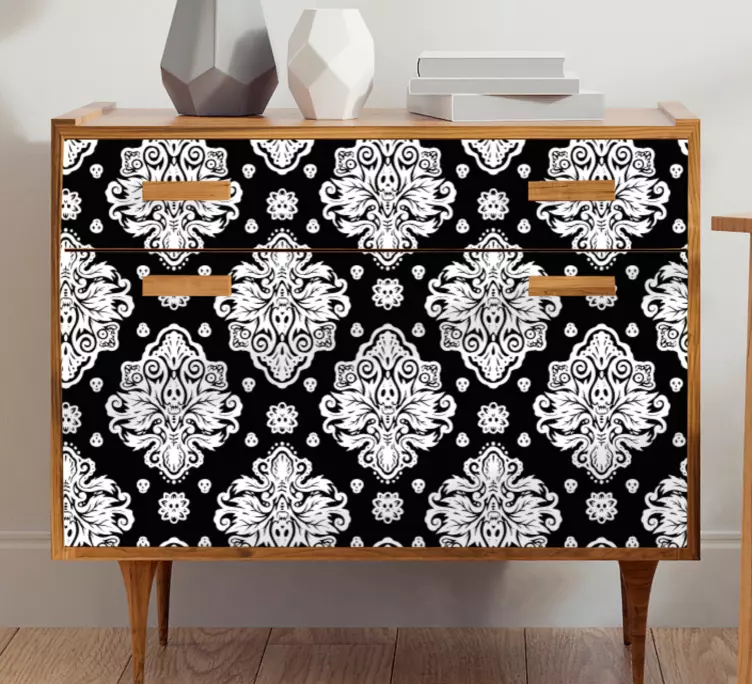 Odkrijte našo Elegant pattern overlay nalepko za pohištvo, ki združuje edinstven dizajn z modernimi elementi. Ta nalepka prinaša čudovite lobanje in cvetlične vzorce, obogatene z damastnimi detajli, ki dodajo eleganco vsakemu kosu pohištva. V črno-beli barvni paleti je ta okrašen vzorec idealen za oblikovanje pohištva in osvežitev vaše domače notranjosti!