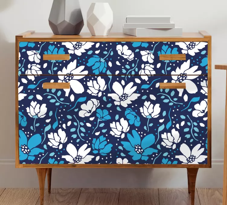 Odkrijte čarobnost in svežino narave z našo Floral motif drawers nalepka za pohištvo. Ta čudovit dizajn, ki vključuje marjetice in cvetlične vzorce v modri in beli barvi, bo vašemu pohištvu dodal posebno noto. Listi in cvetovi se harmonično prepletajo ter ustvarjajo občutek narave, ki vas bo navdušil in osvežil vsak prostor. Ne glede na to, ali gre za dnevno sobo, spalnico ali pisarno, ta nalepka prinaša eleganten in svež videz!