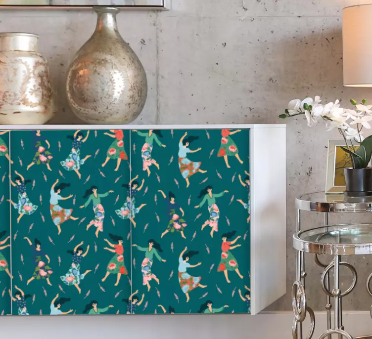 Odkrijte Joyful movement pattern nalepko za pohištvo, ki prinaša barvitost in dinamiko v vaš dom. Ta čudovita nalepka, ki prikazuje ženske, ki plešejo, prinaša praznovanje in veselje v vsak prostor. Njena zasnova vključuje številne vzorce, ki navdihujejo gibanje in ustvarjajo veselo vzdušje, kjerkoli jo namestite.