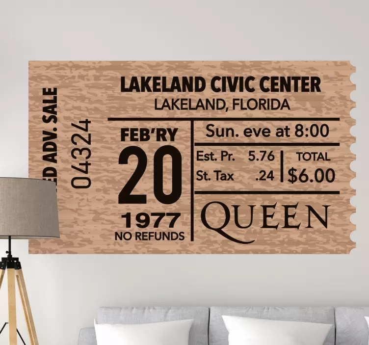 Poročilo: A49733Vintage vstopnica iz Lakeland Civic Center, ki prikazuje dogodek skupine Queen, ki je potekal 20. februarja 1977. Ta dizajn poudarja zgodovinski pomen živih glasbenih dogodkov, prikazuje podrobnosti vstopnice, kot so lokacija, datum in cena, kar pritegne ljubitelje glasbe in zbiratelje.