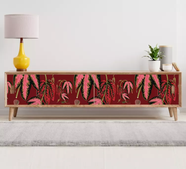 Ponovno preoblikujte svoje pohištvo z našo Lush leaf motif nalepko za pohištvo, ki prinaša živahno naravno estetiko v vaš dom. Ta čudovita nalepka za pohištvo vključuje ilustracije marante, ki združujejo rdečo, zeleno in roza barvo v cvetličnem vzorcu, kar ustvarja edinstven pohištveni poudarek. Naravna floristična tematika bo vašo notranjost napolnila z energijo in svežino, ki jo prinaša narava.