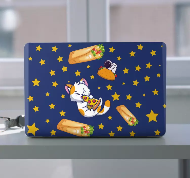 Te smešne vinilne nalepke so idealne za oblikovanje hrbtnega dela vašega prenosnega računalnika. S svojo modro tapeto z mačko, obdano z burritom in pico ter rumenimi zvezdicami, bodo te nalepke zagotovo pritegnile pozornost.