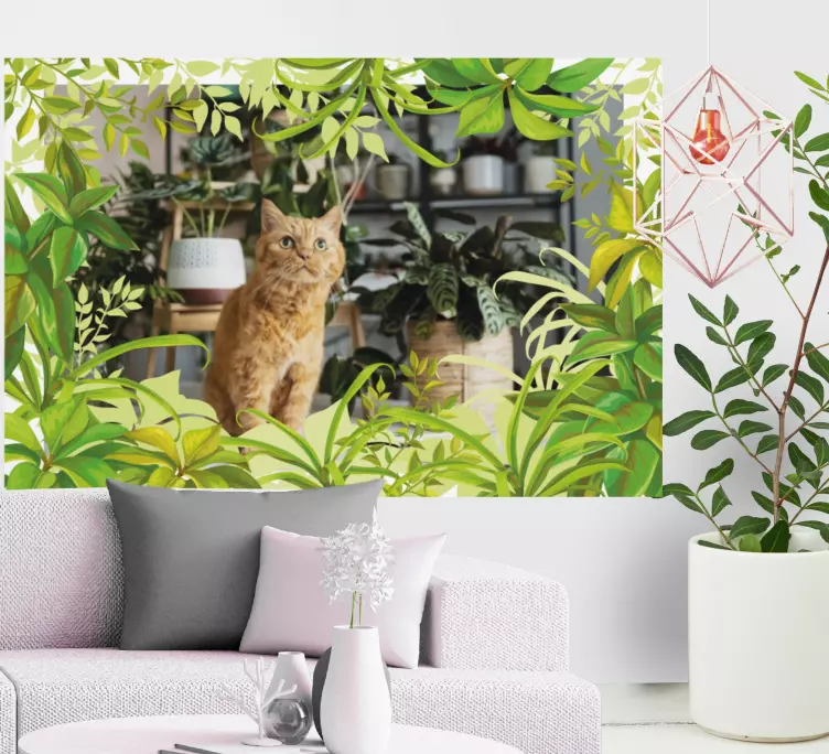 Poročilo: A48313Čarobna scena, ki prikazuje pozorno mačko, obdano z bujno zelenjem. Oblikovanje ujame bistvo narave, prepleteno z domačim udobjem, in prikazuje mačkino radovedno naravo med različnimi sobnimi rastlinami.