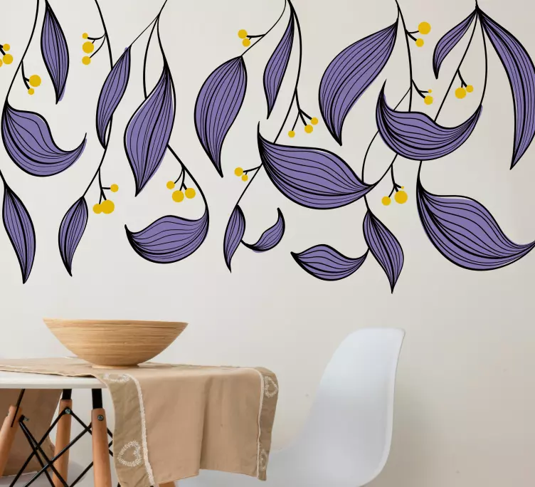 Poročilo: A48215Stilizirani vijolični listi, okrašeni z rumenimi poudarki, ustvarjajo elegantno postavitev. Zapleteno prepletanje listov daje svež in živahen občutek, kar ga naredi za popolno izbiro za izboljšanje bivalnih prostorov. Ta dizajn dodaja pridih narave, ne da bi preobremenil okolico.