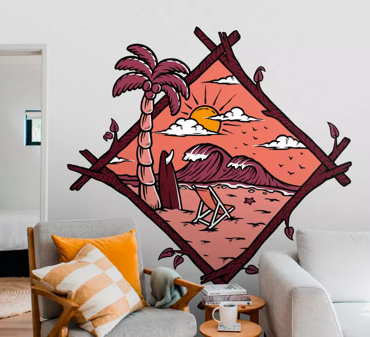 Odkrijte edinstven Tropical beach scene naravna nalepka, ki prinaša čar tropskih plaž kar v vaš dom! Ta izjemen dizajn prikazuje osamljenega deskarja, ki uživa v valovih ob sončnem zahodu, obdanega s palmami in visokimi gorami. Ustvarite vzdušje sprostitve ter uživajte v prizoru, ki vas popelje na sanjske plaže, tudi ko ste doma.