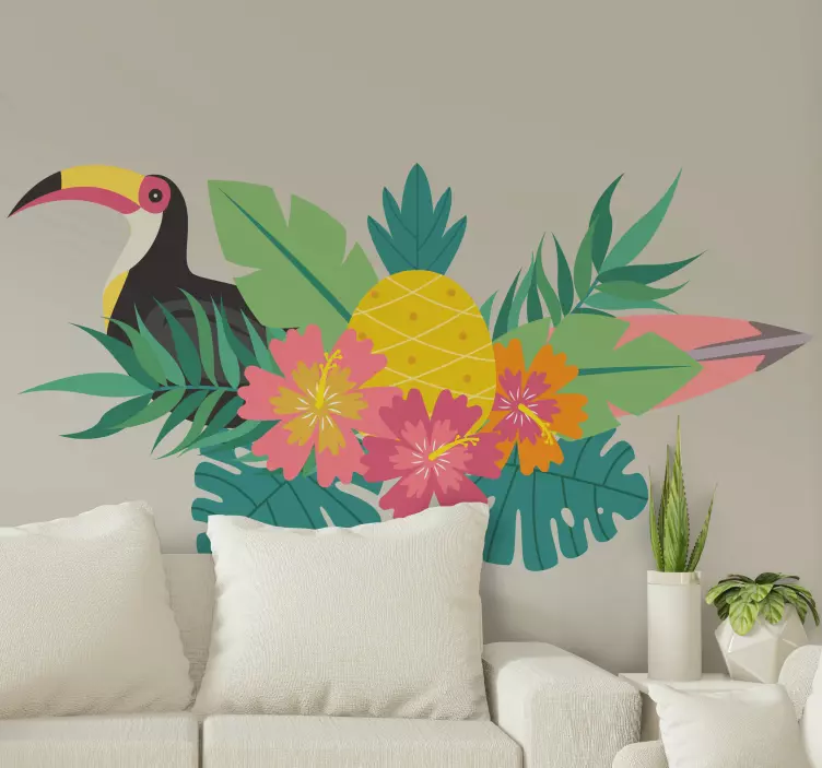 Vstopite v tropski svet z našo Tropical bird design nalepko živali, ki prinaša živahne barve in eksotične motive v vaš dom. S svojim čudovitim dizajnom, ki vključuje tukana, ananas in rože med bujnim zelenjem, ta nalepka zagotavlja, da bo vsak prostor oživel. Barvite ptice in listi ustvarjajo igriv in živahen ambient, ki vas bo vsak dan navduševal.