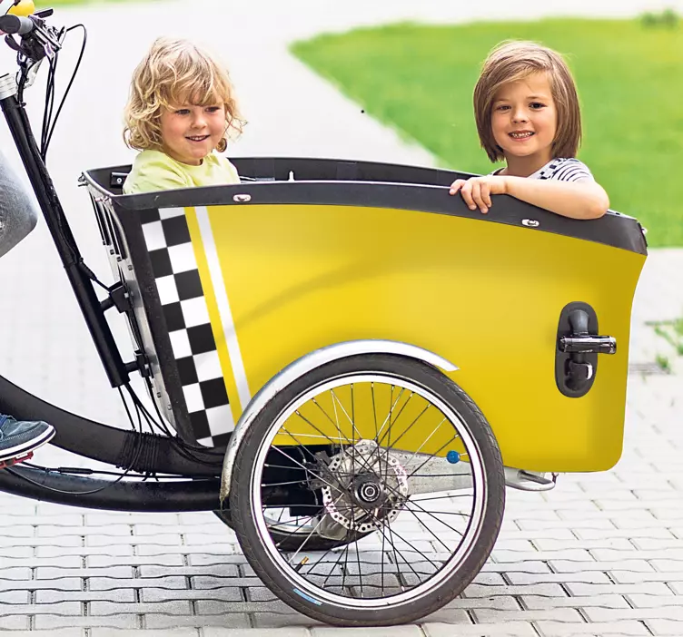 Yellow taxi design nalepka za kolo prinaša igriv in zabaven grafični dizajn, ki vas bo navdušil na vsakem koraku. Zasnovana je tako, da posnema videz taksija, kar doda edinstveno noto vašemu kolesu. S svojo rumeno barvo in motivom tovora, ki prevozi otroke, je ta nalepka idealna izbira za vse, ki želijo dodati kanček veselja in transportnega duha svojemu kolesu, bodisi da gre za bakfiets ali običajno kolo. Uživajte v vsakem sprehodu po mestu z nalepko, ki pritegne poglede!