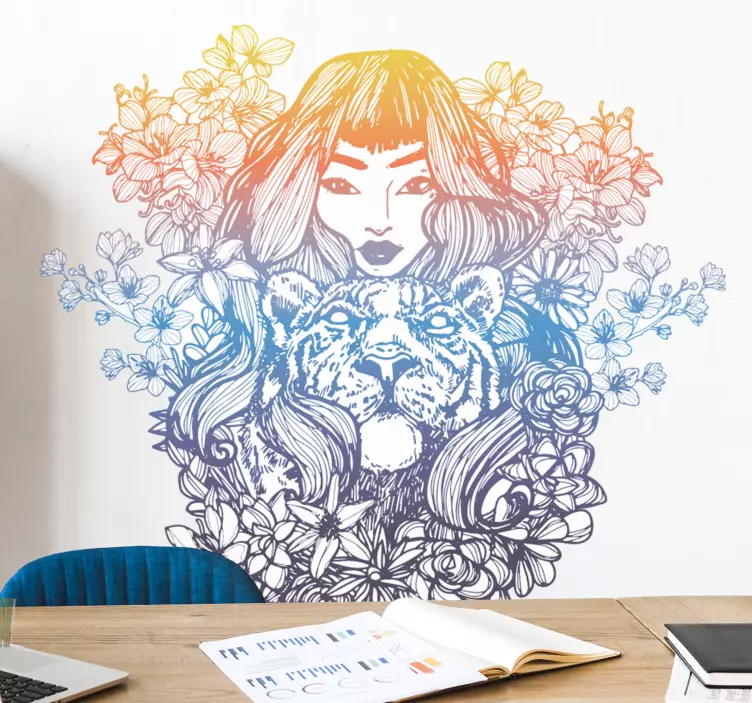 Ženska s tigrom nalepka živali prinaša edinstven in umetniški pridih vašemu prostoru. Ta čudovita nalepka združuje keltske motive z močjo tigra in ženskostjo, kar ustvarja osupljivo umetniško delo. Risanje rož in cvetličnih motivov v drznem gradientu ter črtni umetnosti daje nalepki poseben značaj, ki ga preprosto morate imeti! Odkrijte, kako lahko ta izdelek obogati vaš dom in poglejte, kako se bo vaša notranjost prelevila v pravo umetniško galerijo!