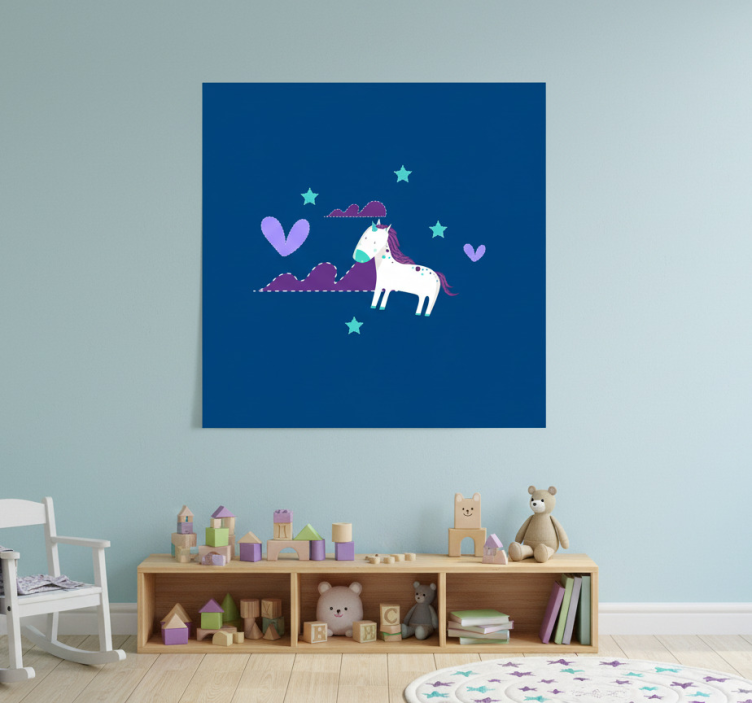 Ta očarljiva ilustracija prikazuje domišljijskega belega enoroga, ki stoji pred temno modrim ozadjem. Okoli tega magičnega bitja so stilizirani oblaki, pisane srčke in zvezde, kar ustvarja očarljivo vzdušje. Igriv dizajn vključuje mehke barve, kot sta vijolična in teal, kar ga dela idealen dekorativni kos za otroške sobe.