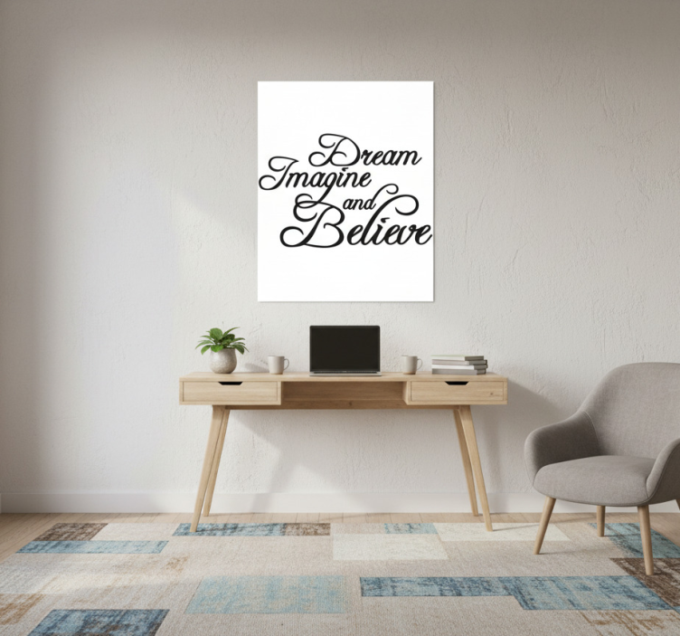 Dreame imagine and believe pisarniški plakat je več kot le dekoracija; je vaš vsakodnevni opomnik o sanjah in verovanju v sebe. Ta pisarniški plakat vas bo navdihnil, da sledite svojim ciljem in ostanete pozitivni, tudi v najtežjih trenutkih. Njegova izjemna grafika in sp sporočilo vas vsak dan spomnita, da je vse mogoče, če le verjamete v svoje sposobnosti. Ne dovolite, da vas vsakodnevne obveznosti zadušijo – okrasite svoj prostor in si dodajte motivacijo ter energijo!