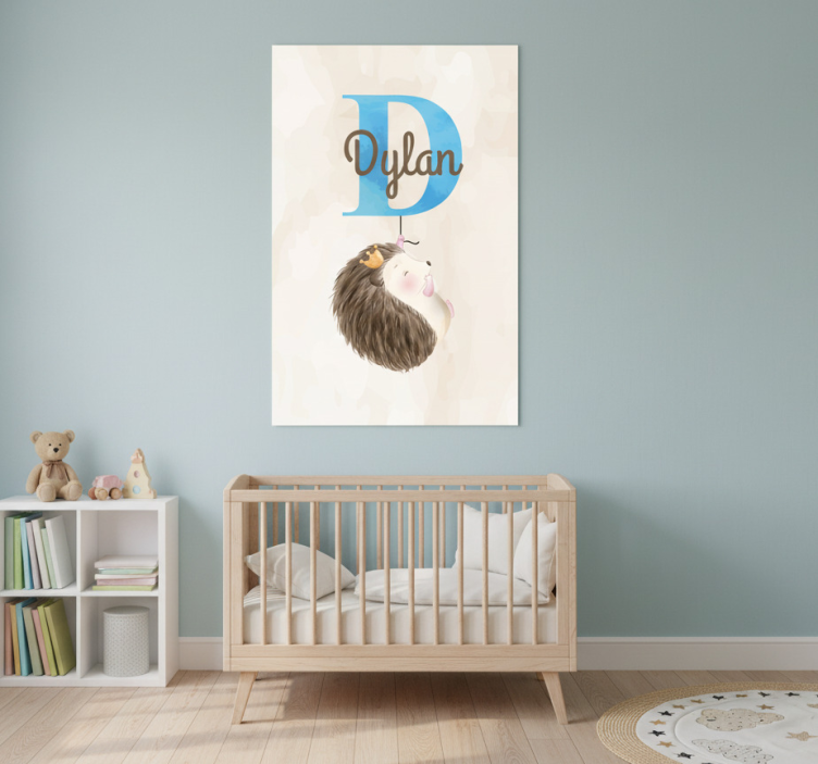 Slika prikazuje očarljivo ilustracijo otroške sobe, ki prikazuje igrivega ježa, ki visi iz modre črke 'D.' Spodaj je ime 'Dylan' elegantno zapisano v stilizirani pisavi. Ta ljubka zasnova, postavljena na mehkem bež ozadju, prinaša toplino in veselje, kar jo dela popolno za dekoracijo otroške sobe.