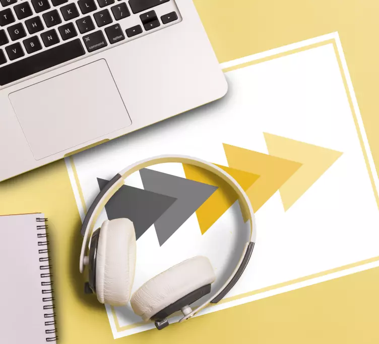 Dynamic arrow motif podloga za miško z pošastmi je prava izbira za vse, ki iščejo moderni in minimalistični dodatek za svojo pisarno ali delovno mesto. S svojimi geometrijskimi oblikami, ki vključujejo trikotnike in puščice, ta podloga prinaša nordijski pridih, ki se odlično sklada z rumeno, sivo in črno barvno paleto. Ilustracija, ki združuje te elemente, zagotavlja edinstven izgled, ki bo pritegnil poglede in popestril vsak delovni prostor.