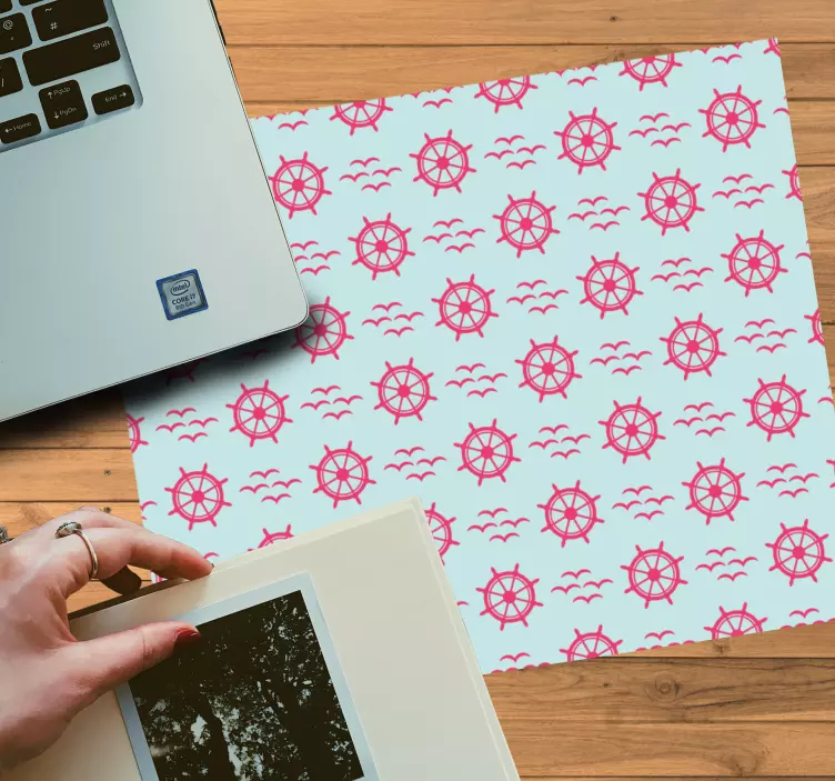 Odkrijte edinstveno Nautical steering wheels podlogo za miško z pošastmi, ki združuje navtični dizajn s čarobnimi ilustracijami. Ta podloga ponuja čudovit vzorec volanov, ptic in morskih motivov v živahnih roza in modrih odtenkih, kar ustvarja prijetno vzdušje za vašo pisarno ali igralni kotiček. Vsak pogled na to podlogo vas bo popeljal na morsko pustolovščino, kjer krmilite svoje ideje in ustvarjalnost!