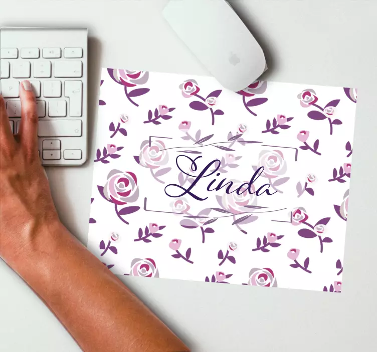 Ta prilagojena podloga za miško ima belo tapeto, ki je okrašena s številnimi vijoličnimi vrtnicami. Na sredini je dodano ime po vaši izbiri, kar naredi podlogo še bolj osebno. Ta podloga za miško je na voljo v različnih velikostih, zato jo lahko naročite zdaj in si jo prilagodite po svojih željah!