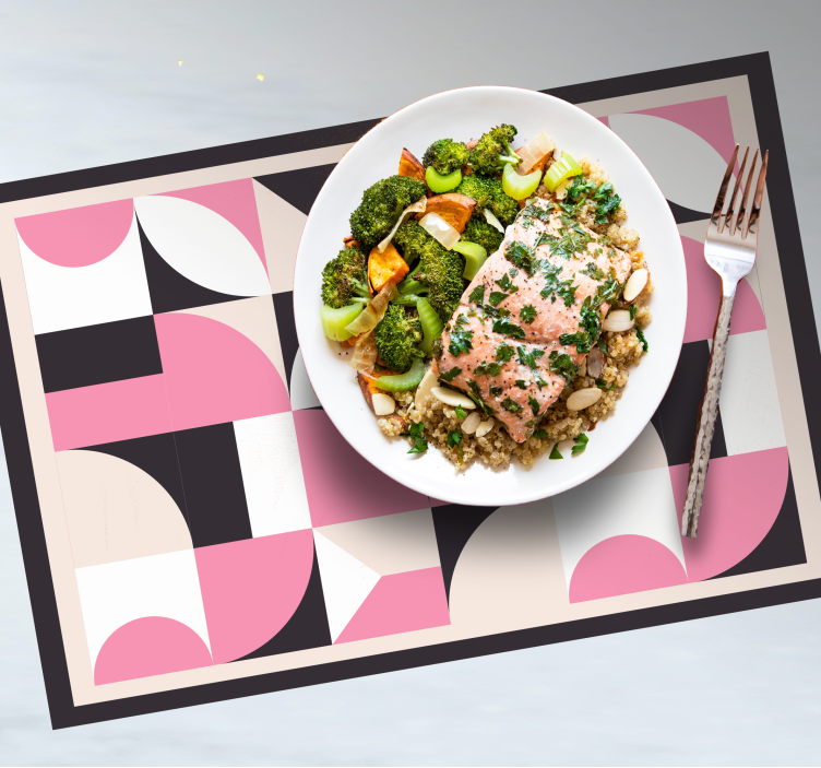 Uživajte v vrhunskem oblikovanju z našim Geometric patterned placemat sodobno prostiranje. Ta moderno zasnovan pogrinjek s geometrijskimi vzorci je prava izbira za vsak dom. Njegova barvita in vzorčasta grafika prinaša svežino in energijo v vašo jedilnico, kjer se elegantno povezuje s sodobnim stilom. Vsak element tega grafično zasnovanega pogrinjka je skrbno izbran, da ustvari harmonično celoto, ki bo navdušila vaše goste!