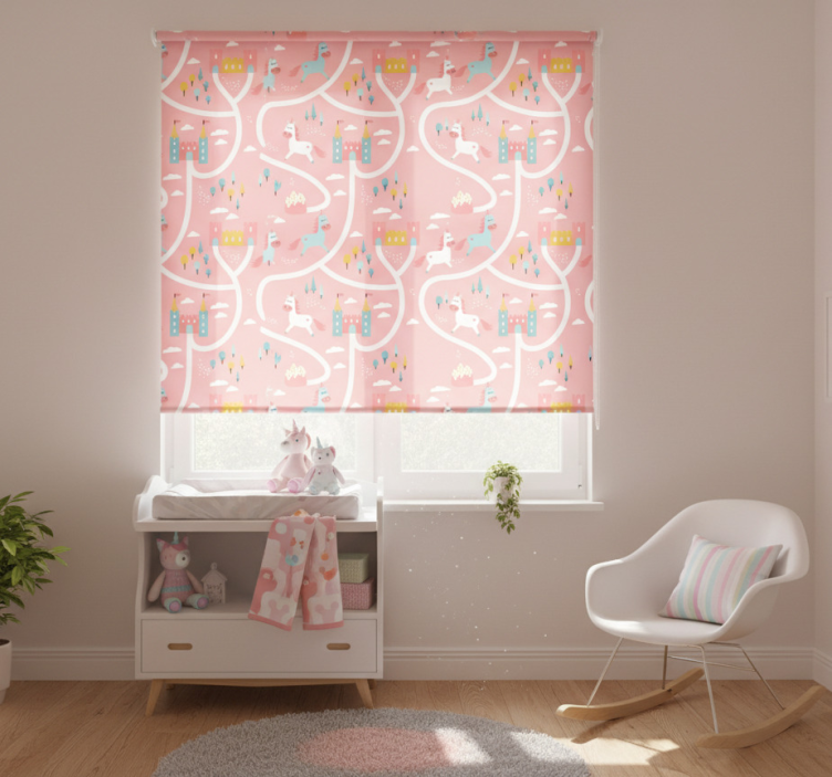 Otroška rolo senčila v roza risanih enorogih in gradovih
