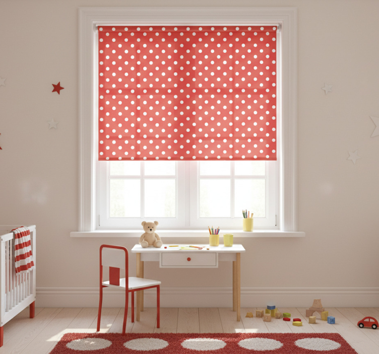 Otroška rolo senčila z belimi retro pikami na rdeči podlagi