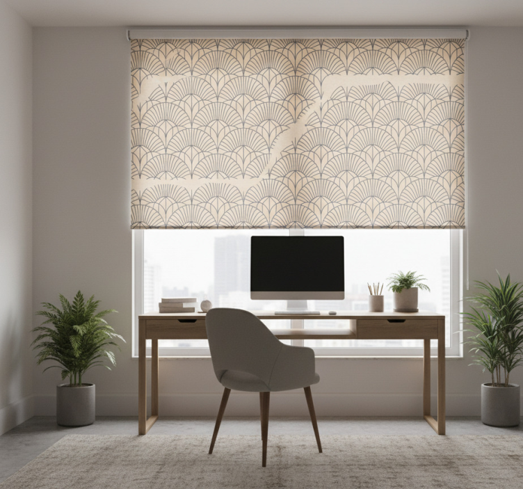 Rolo zavesa za domačo pisarno v abstraktni bež vzorcu