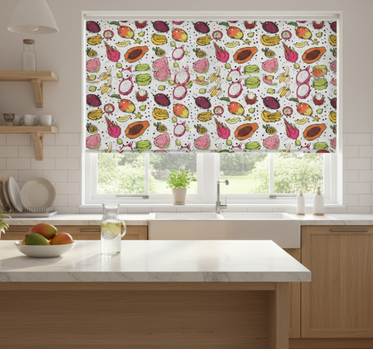 Rolo zavesa za kuhinjo skica pisanih eksotičnih sadežev