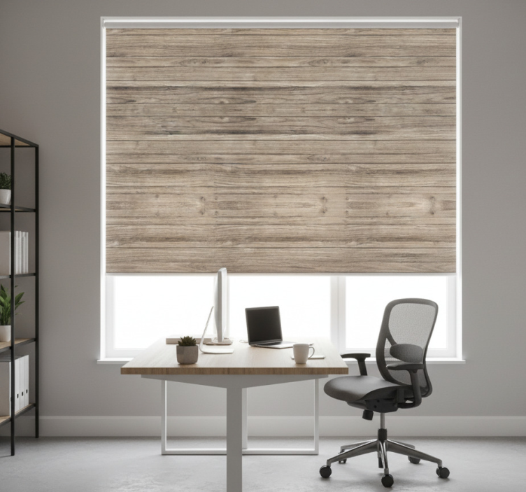 Rolo zavesa za pisarno sivi rustikalni leseni deske