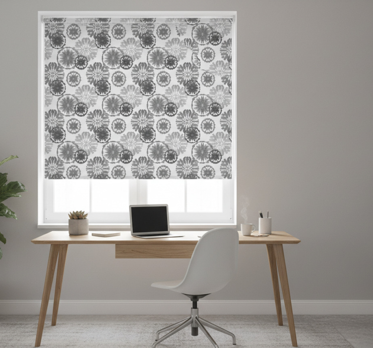 Rolo zavesa za pisarno sivo slikano iluzijo