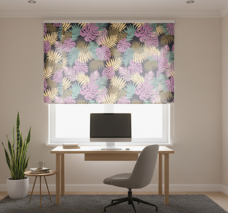 Rolo zavesa za pisarno tropske zelene in roza liste