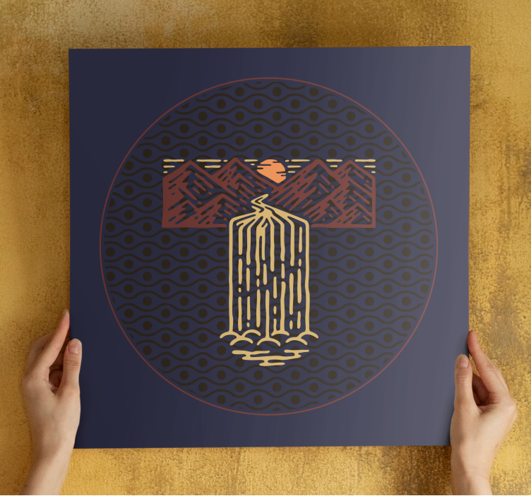 Poročilo: Q7828Pomirjujoča kompozicija, ki prikazuje slap, ki pada med stiliziranimi gorskimi vrhovi in zahajajočim soncem. Krožna zasnova dodaja harmonijo, medtem ko zapletene linije vzbujajo občutek miru in povezanosti z naravnim svetom.