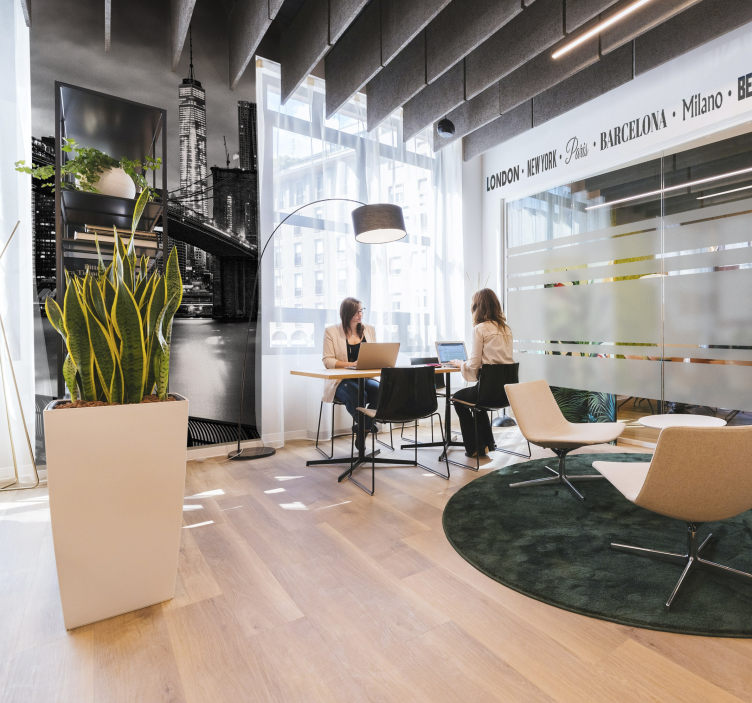 Poročilo: F12189Sodobni pisarniški prostor vključuje dve osebi, ki se udeležujeta sestanka, z osupljivo mestno panoramo na zidu, ki prikazuje ikonične znamenitosti. Živahna rastlina dodaja pridih narave in izboljšuje interaktivno okolje. Oblikovanje poudarja mešanico urbanega življenja in profesionalnega sodelovanja.