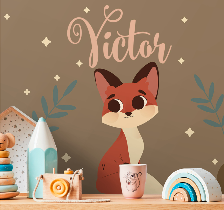Poročilo: F9831Očarljiv lik lisice z velikimi očmi in igrivim značajem, obdan z nežnim listjem in zvezdami. Oblikovanje vključuje ime 'Victor', kar dodaja osebno noto temu čudovitemu motivu, ki je popoln za otroške prostore ali igrive površine.