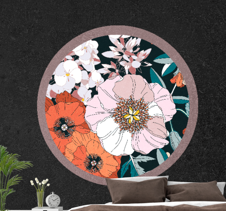 Odkrijte čarobnost Floral circle design fototapet s cvetjem, ki prinaša naravne elemente v vaš dom. Ta ročno narisana ilustracija cvetja, ki vključuje mak in druge cvetlice, je zasnovana tako, da ustvari harmoničen krog, ki vas bo navdušil in osvežil vsak prostor. S svojimi mat barvami in edinstvenim dizajnom bo ta cvetlični motiv zagotovo pritegnil poglede in dodal poseben pečat vašemu ambientu!
