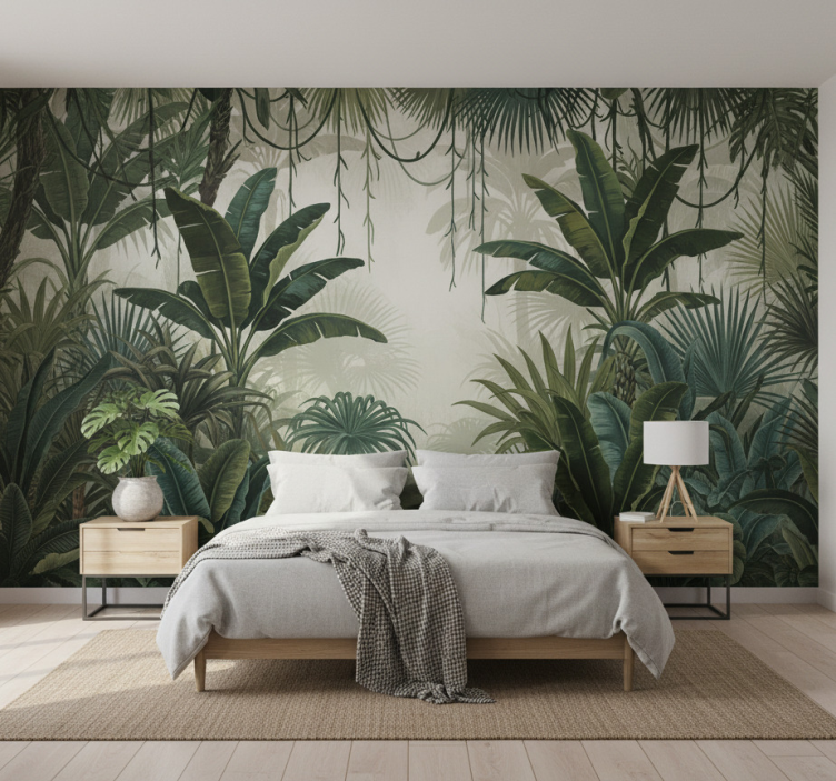 Zapleten prikaz goste vegetacije, ki vključuje velike palmove liste in padajoče trte. Različne tropske rastline ustvarjajo občutek globine in življenja, vnašajoč esenco narave. Nežna postavitev zelenja poudarja lepoto botaničnega sveta, kar zagotavlja mirno vizualno izkušnjo.