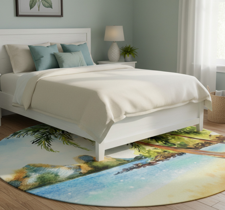Živahen krožni dizajn, ki prikazuje bujne palme proti mirnemu obrežju. Umetniško delo ujame mirno morsko prizorje z nežnimi valovi, ki se plazijo ob peščeni obali. V daljavi se dvigajo gore, dopolnjene z mehkimi modrimi, zelenimi in peščenimi odtenki, kar vzbuja pomirjujočo tropsko vzdušje.