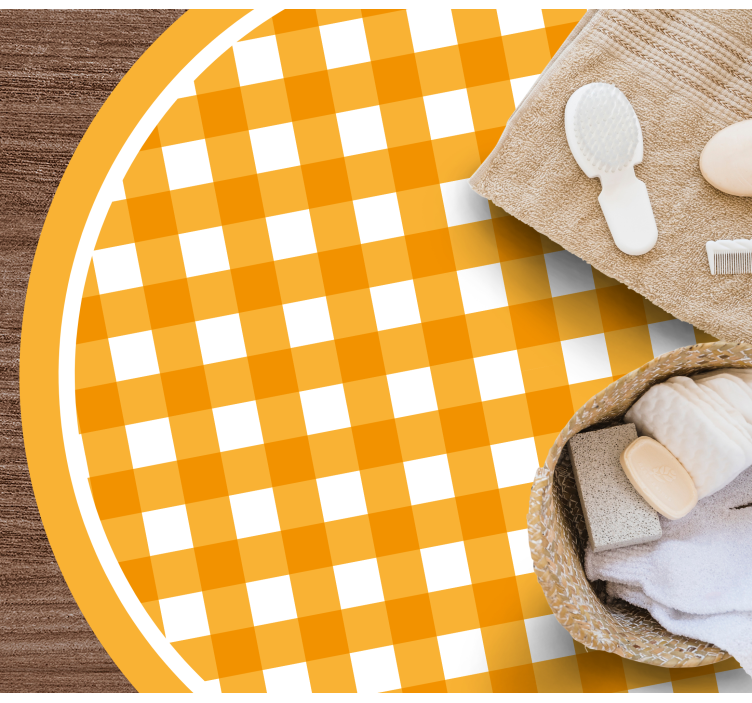 Poročilo: R19703Živahen, topel karirast vzorec prikazuje izmenične oranžne in bele kvadrate, kar ustvarja igriv, a hkrati pomirjujoč učinek. Oblikovanje je okroglo, obrobljeno z enotnim oranžnim robom, kar prispeva k veseli vizualni podobi, ki izstopa.
